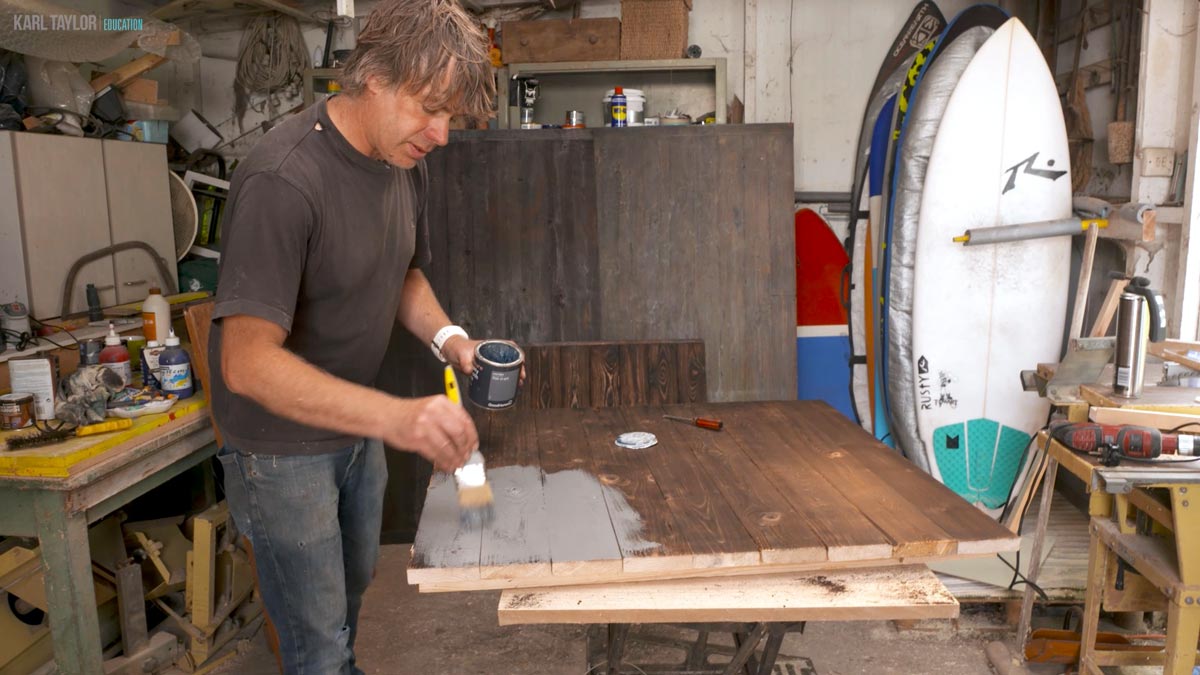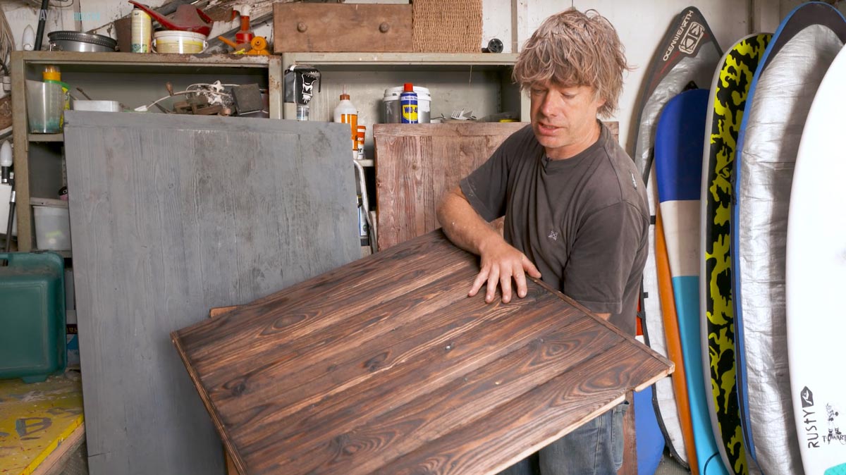 The initial burning of wood creates the worn aged look to the wood. When the blow torch is passed over the wood the first time the softer wood between the grain burns more than the grain. Next, you will see in the video I pass the wire brush over the surface to remove some of the burnt surface and leave the texture of the grain.