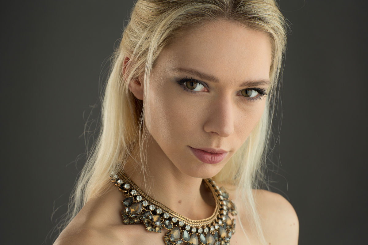 Limited to only two lights, I decided to use a reflector to soften the shadows and add some extra light on the left side of the model’s face. I tried a white fill card and silver reflector to see which result I preferred, eventually opting for the softer white reflector.