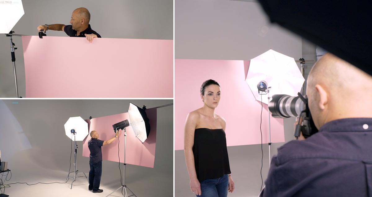 I placed my background close behind the background lights, which meant the light spilling onto it created a soft pastel pink color. I knew the nature of this setup meant that initially my lighting wouldn’t be even, but I could control that by adjusting the angle of my background, lights or model.