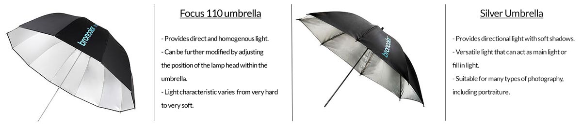 I knew my lighting would consist of two silver umbrellas placed either side of my background, facing towards camera to create a rim light around my model. I then used the Broncolor deep focus umbrella as my fill light. This choice of modifier meant I’d have greater control over the hardness or softness of the shadows under the model’s chin.