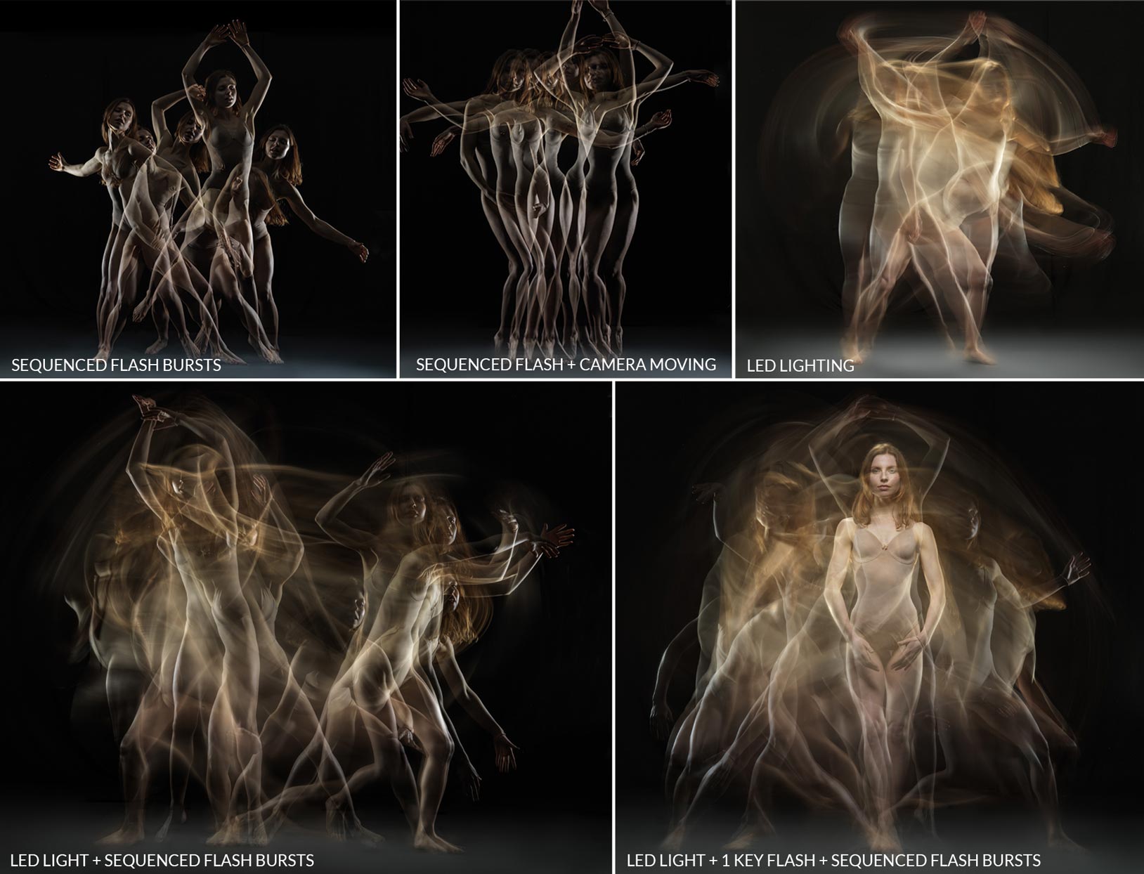 Karl, If you take manual control of the opening and closing of the shutter by placing the camera in bulb, this would allow you to use second curtain flash and close the shutter immediately after the model comes to rest in the pose you have both chosen at the end of the sequence. Wouldn’t this give you a more distinct and properly exposed main image amongst the blur?