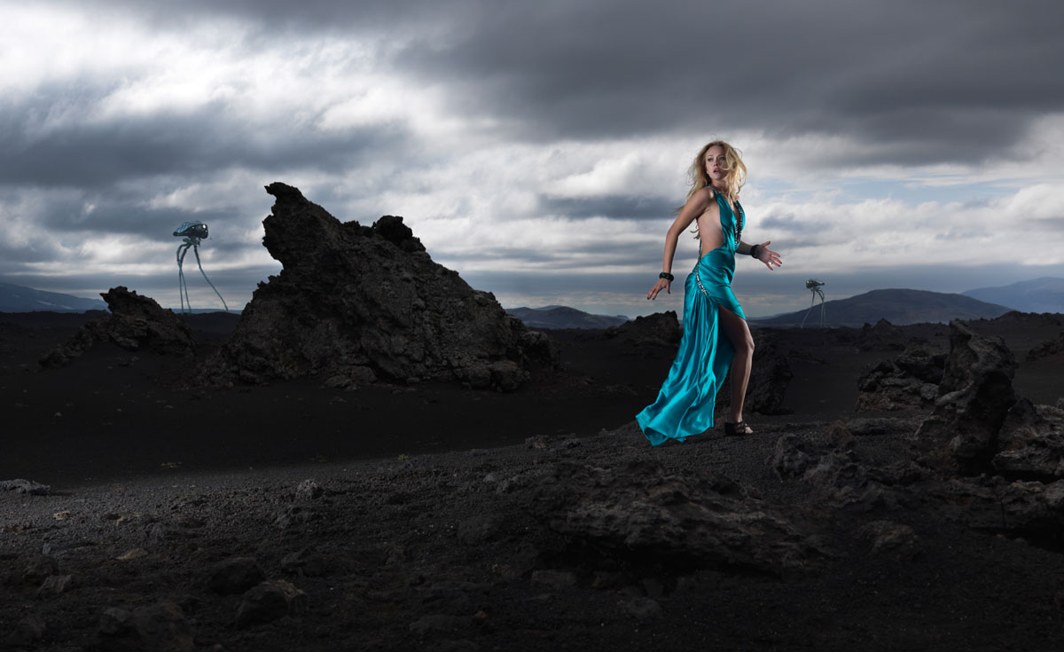 Hi Martin, first of all let’s study the image in more detail on a bigger scale you can view it here https://karltaylor.com/dtsc7eonibah3jjclrlzek8yy2otgi if this doesn’t load find it in the ‘people’ section on this website. You will see that the key light is on the face in the direction she is looking, this is coming from the Para 222. The Para 222 is such a big light that it lights pretty evenly down her whole body on my camera left, it also puts some light on the floor which I liked as it gave the feeling that it could be a search light from one of the ‘alien’ tripods. On the right side you can see that her blonde hair is lit and also her leg and knee. As these were from the 88 paras one is doing the top half and the other doing the lower half and I can choose if I want more light at the top or the bottom half. This is also useful as if I were to use the ND Grad then I could punch more light in just on the top half.
