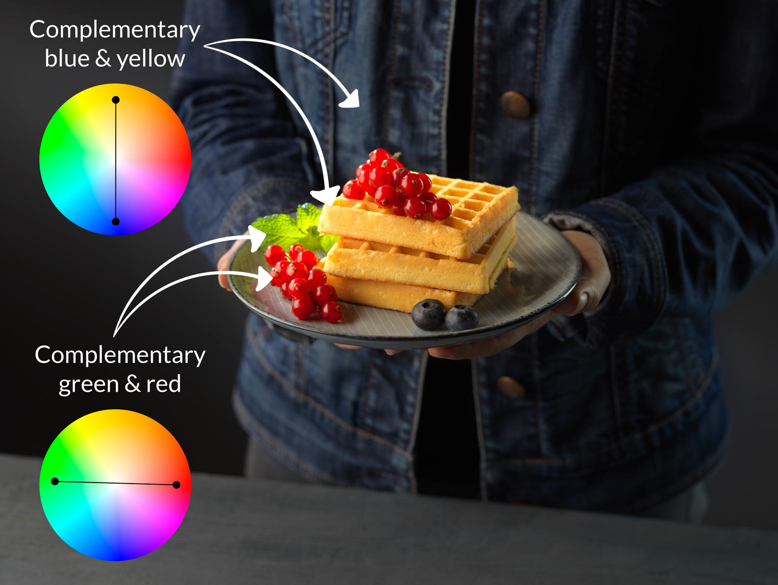 As you’ll see in the class, one of the first things we addressed was the choice of outfit. Eventually opting for the blue denim jacket, this provided a great contrast with the golden yellow of the waffles, the bright red berries and pop of green mint.