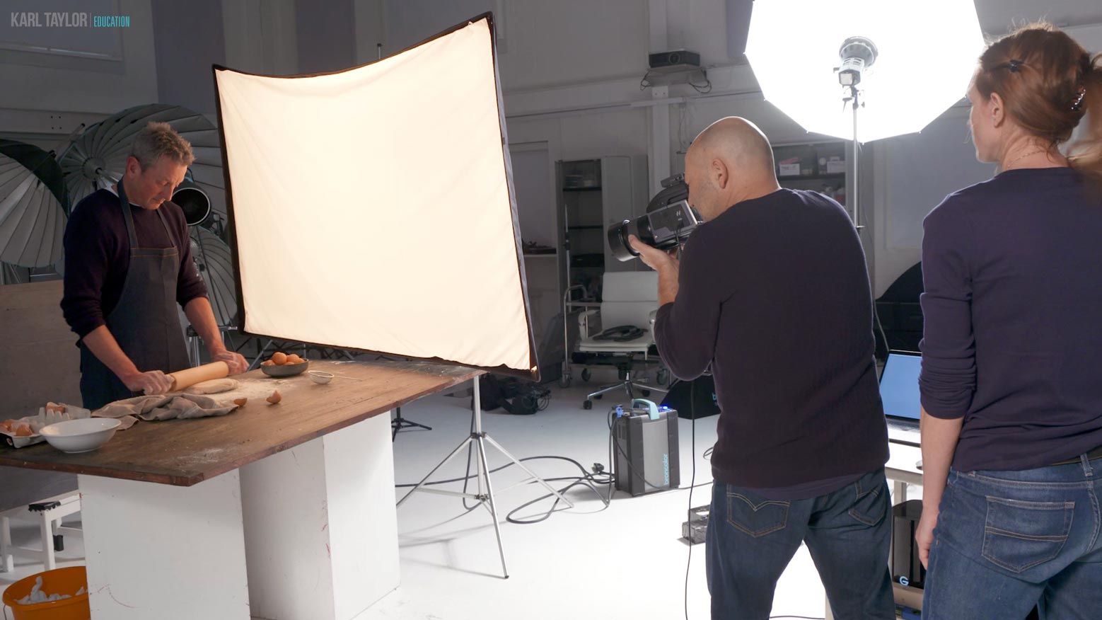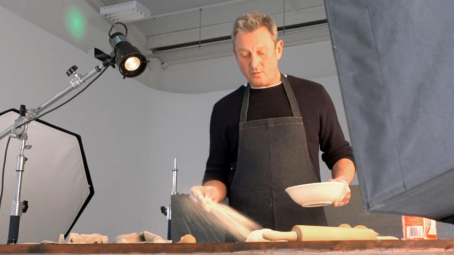 Karl used a three light setup to achieve soft, dappled lighting. The setup needed to be versatile enough to allow a smooth, uninterrupted workflow as the subject worked through the sequence of shots, from cracking eggs, to rolling dough.