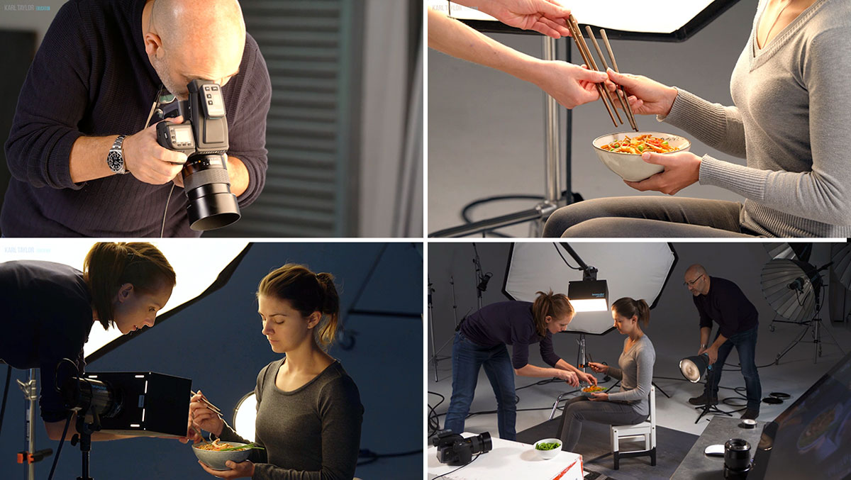 Lighting, styling and posing hands are just a few of the challenges Karl and Anna faced in this food photography class, where they photographed a still life image of a model holding a bowl of stir fry.